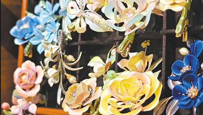 在市集非遗专区琳琅的摊位中,一个摆满缤纷丝线花饰的角落尤为醒目——嫩粉的梅、宝蓝的菊、柿红的果,在灯光下泛着柔和光泽。