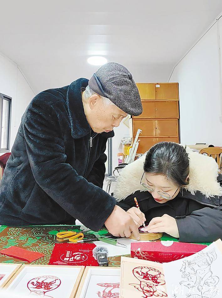 2月9日,仙桃雕花剪纸市级传承人戚小悟(左)指导湖北日报全媒记者剪纸。